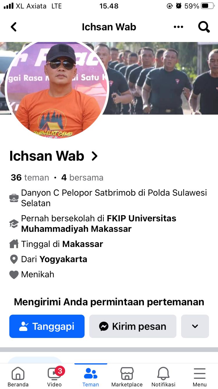 WATAMPONE, TRIBUNBONEONLINE.COM–Identitas Komandan Batalyon (Danyon) C Pelopor Kompol Nur Ichsan, S.Sos., M.Si kembali dicatut orang tak dikenal (OTK). Khususnya melalui akun media sosial Facebook.