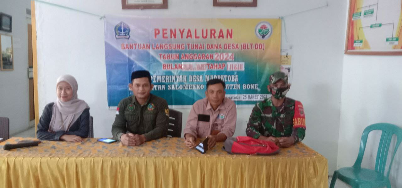 Kegiatan penyaluran BLT yang bertempat diaula kantor Desa mappatoba Kecamatan salomekko Kabupaten Bone ini dihadiri oleh Kepala desa mappatoba Andi Muh. Taif, S.Pd, Babinsa, pendamping desa, para perangkat desa dan warga penerima BLT Desa Mappatoba.