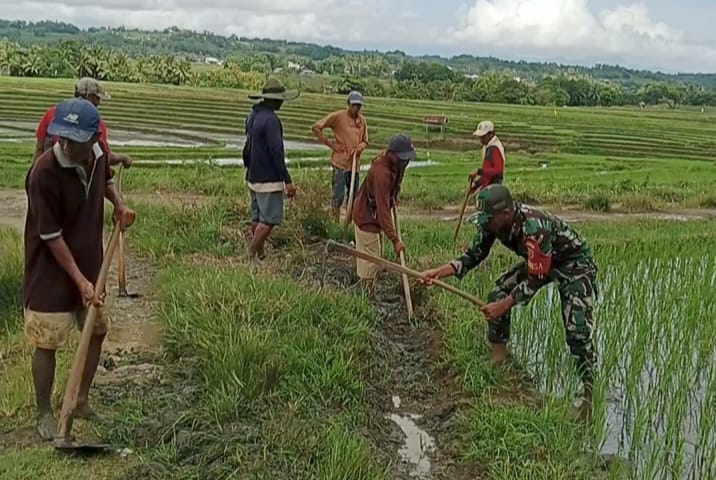 Pada kegiatan tersebut, Babinsa Serda Suardi bersama dengan masyarakat binaannya saling bahu-membahu memperbaiki saluran guna memperlancar air mengalir ke persawahan.