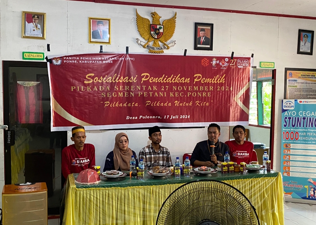 PONRE, TRIBUNBONEONLINE.COM–PPK Ponre mengadakan Sosialisasi pendidikan dan partisipasi pemilih segmen kelompok tani di Desa Poleonro Kecamatan Ponre pada Ahad, 21 Juli 2024.