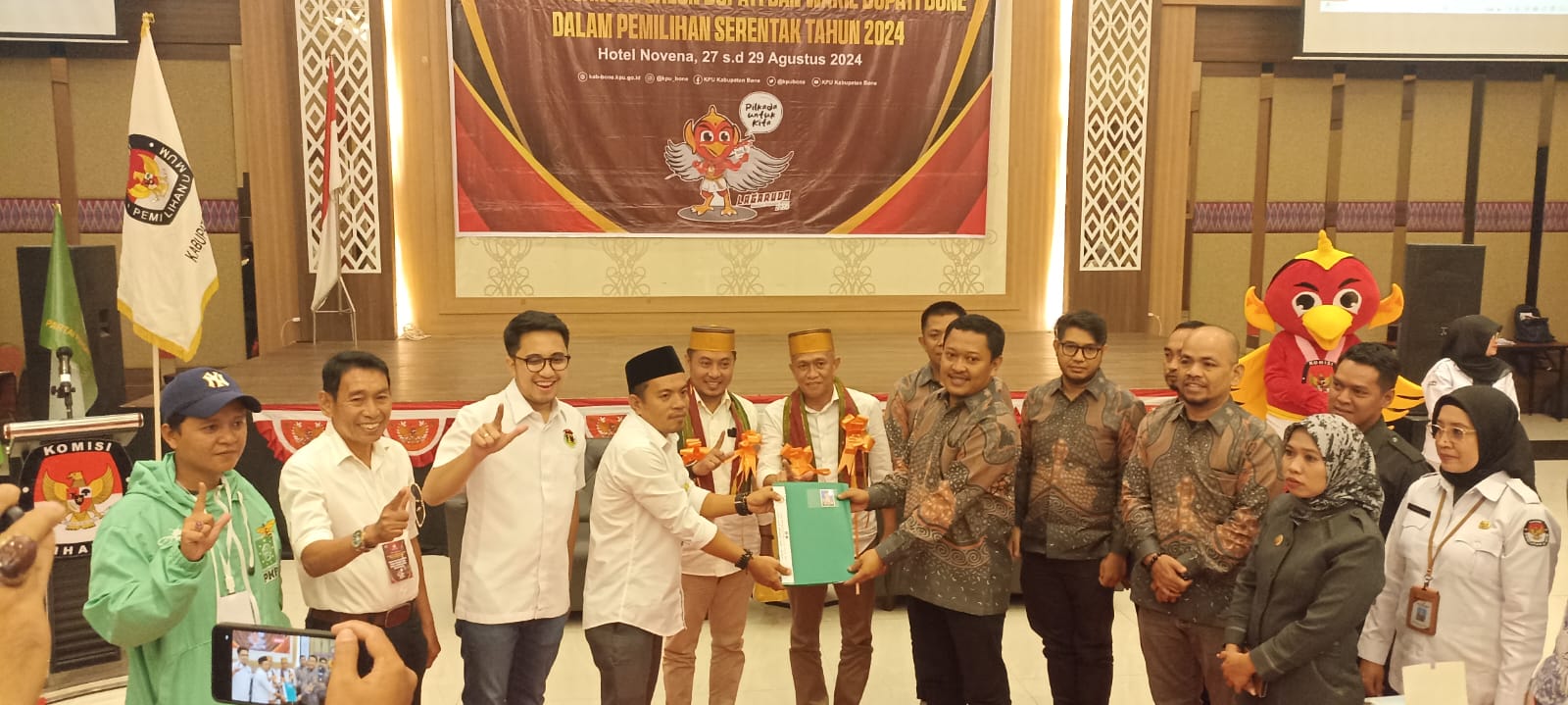 WATAMPONE, TRIBUNBONEONLINE.COMPasangan bakal calon Bupati dan Wakil Bupati Bone, Andi Islamuddin dan Andi Irwandi Natsir, dengan tagline “Tegak Lurus” resmi mendaftarkan diri di Komisi Pemilihan Umum (KPU) Kabupaten Bone. Pendaftaran tersebut berlangsung di Novena Hotel, Kamis, 29 Agustus 2024, sekitar pukul 17.30 WITA.