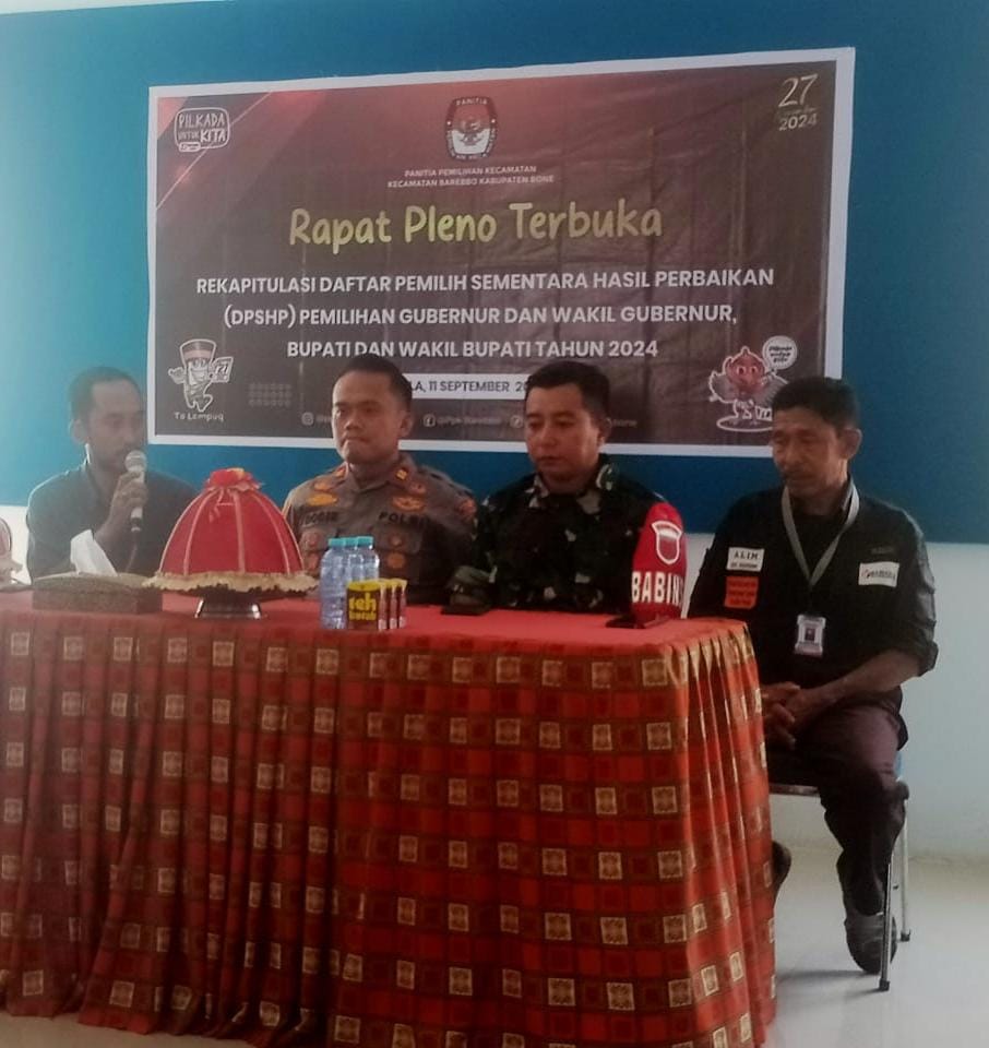 BAREBBO, TRIBUNBONEONLINE.COM–Kapolsek Barebbo, Iptu Dodie Ramaputra, SH, MH menghadiri Rapat Pleno Terbuka Rekapitulasi Daftar Pemilih Sementara Hasil Perbaikan (DPSHP) pada Pemilihan Gubernur dan Wakil Gubernur serta Bupati dan Wakil Bupati Tahun 2024 tingkat Panitia Pemilihan Kecamatan, Kecamatan Barebbo. Rapat tersebut digelar di Aula Kantor Kecamatan Barebbo, Rabu(11/9/24)