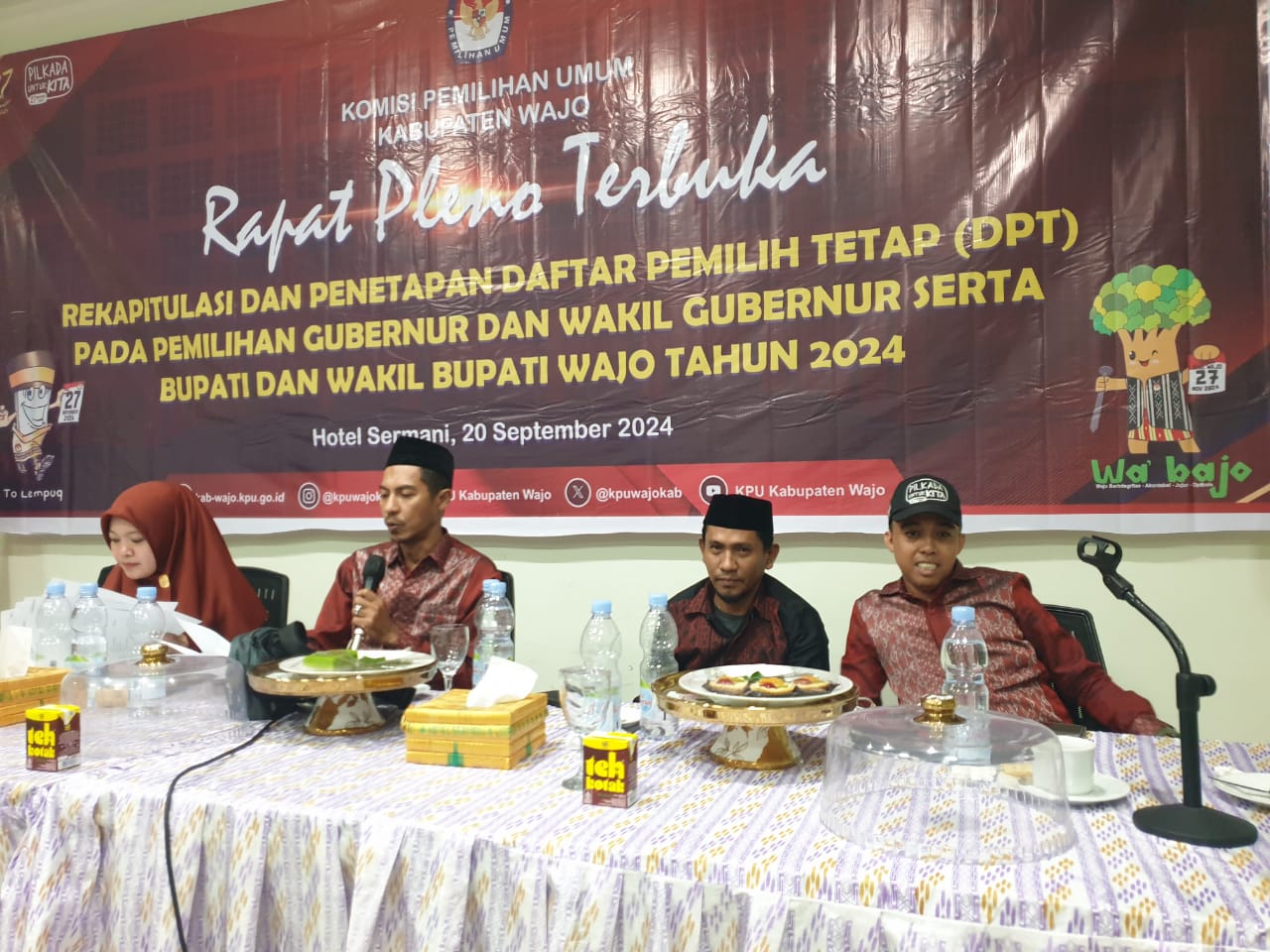 Daftar Pemilih Tetap DPT ini di plenokan oleh Ketua dan Anggota Komisi Pemilihan Umum Kabupaten Wajo bertempat Di hotel Sarmani Sengkang Wajo Jalan Andi Bau Maumud pada Jumat, 20 September 2024.