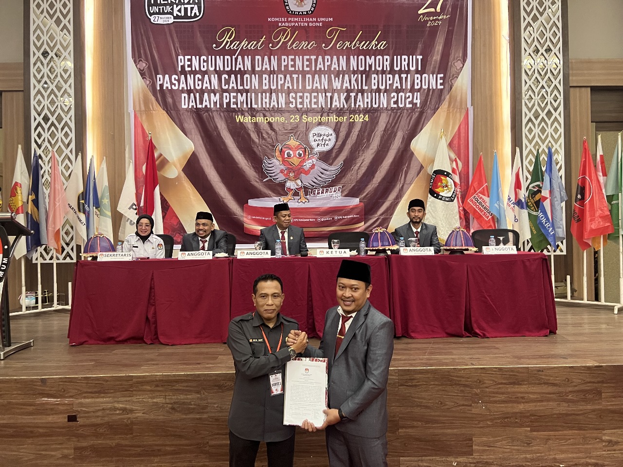 Penetapan nomor urut ini resmi tercatat dalam Berita Acara Nomor 486/PL.02.2-BA/7308/2024 yang dikeluarkan oleh KPU Bone.
