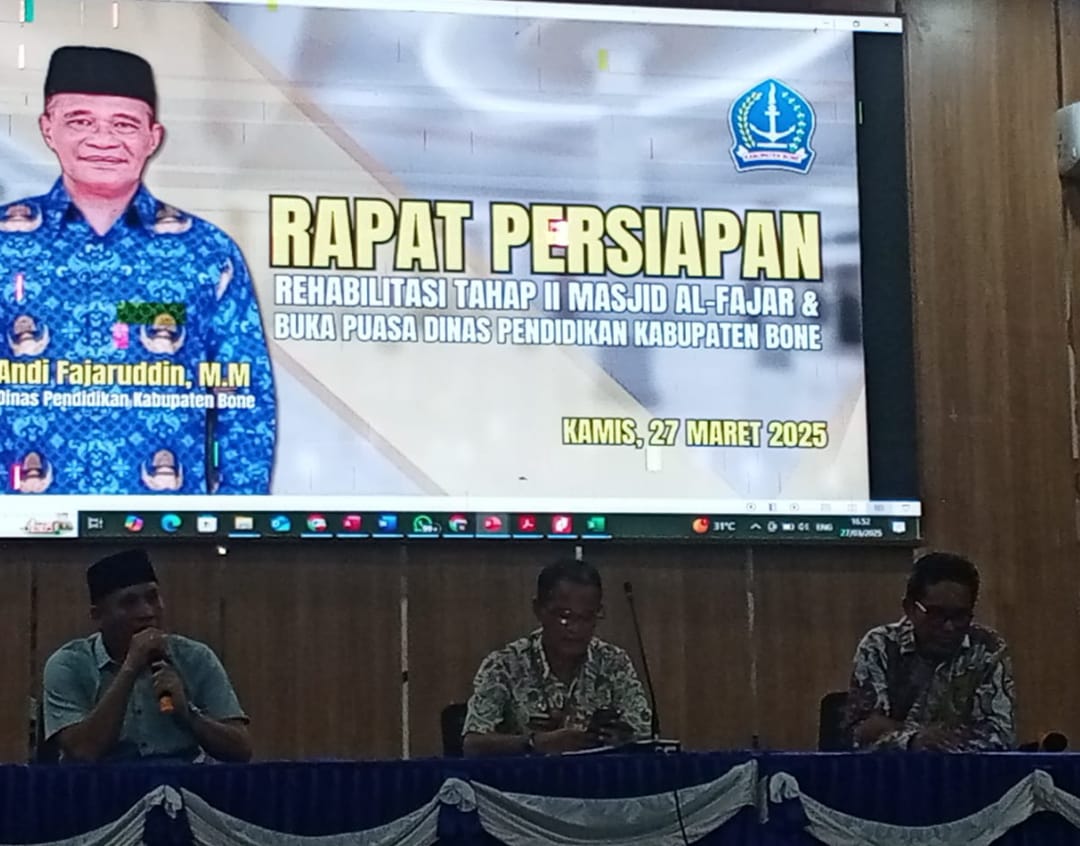 WATAMPONE, TRIBUNBONEONLINE.COM–Bertempat di Aula Lamellong Dinas Pendidikan Kabupaten Bone Jalan Jenderal Gatot Subroto, Watampone telah dilangsungkan Rapat Persiapan Rehabilitasi Tahap II Masjid Al-Fajar dan Buka Puasa Bersama Dinas Pendidikan Kabupaten Bone pada Kamis, 27 Maret 2025 jam 16.00 sampai menjelang buka puasa.