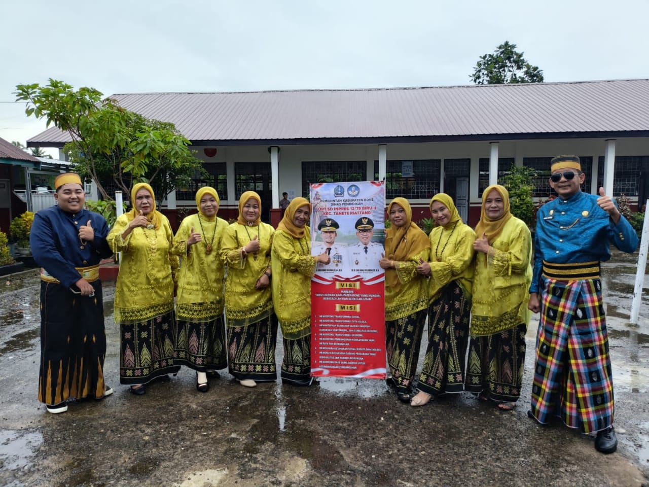 WATAMPONE, TRIBUNBONEONLINE.COM-Suasana berbeda terlihat di SD Inpres 12/79 Biru II Kecamatan Tanete Riattang pada Kamis (10/04/25). Seluruh guru di sekolah tersebut tampil kompak mengenakan pakaian adat dalam rangka memperingati Hari Jadi Bone ke-695.