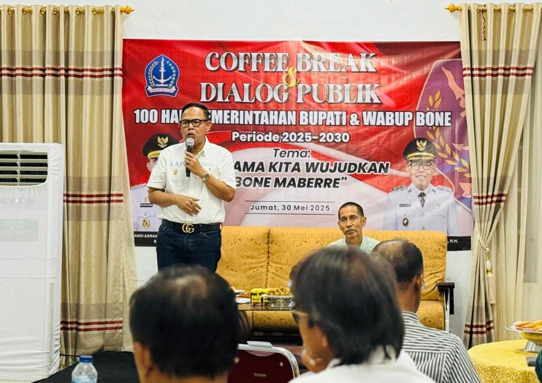 BONE, TRIBUNBONEONLINE.COM–Suasana hangat dan penuh keakraban menyelimuti Rumah Jabatan Wakil Bupati Bone pada Jumat malam, 30 Mei 2024. Di tengah aroma kopi yang mengepul dan bincang santai yang mengalir, Pemerintah Kabupaten Bone menggelar sebuah refleksi sederhana bertajuk Coffee Break 100 Hari Kerja, menandai tonggak awal kepemimpinan pasangan Bupati Bone H. Andi Asman Sulaiman, S.Sos., MM dan Wakil Bupati Dr. H. Andi Akmal Pasluddin, MM yang dikenal dengan tagline “BerAmal”.