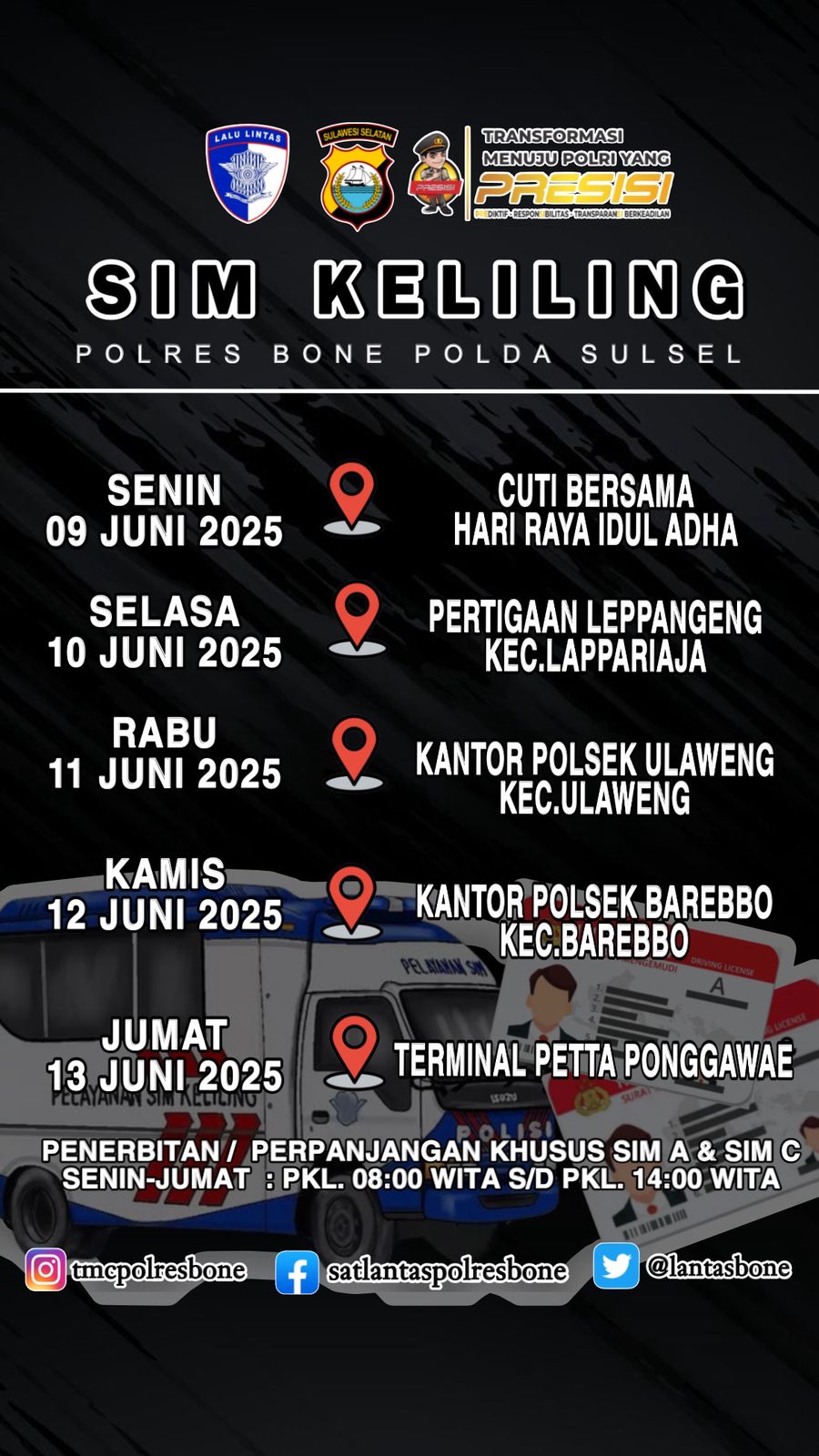Satlantas Polres Bone menyediakan layanan SIM Keliling di 4 Lokasi. Berikut jadwal dan lokasi pelayanan SIM keliling yang dilaksanakan di empat Lokasi :