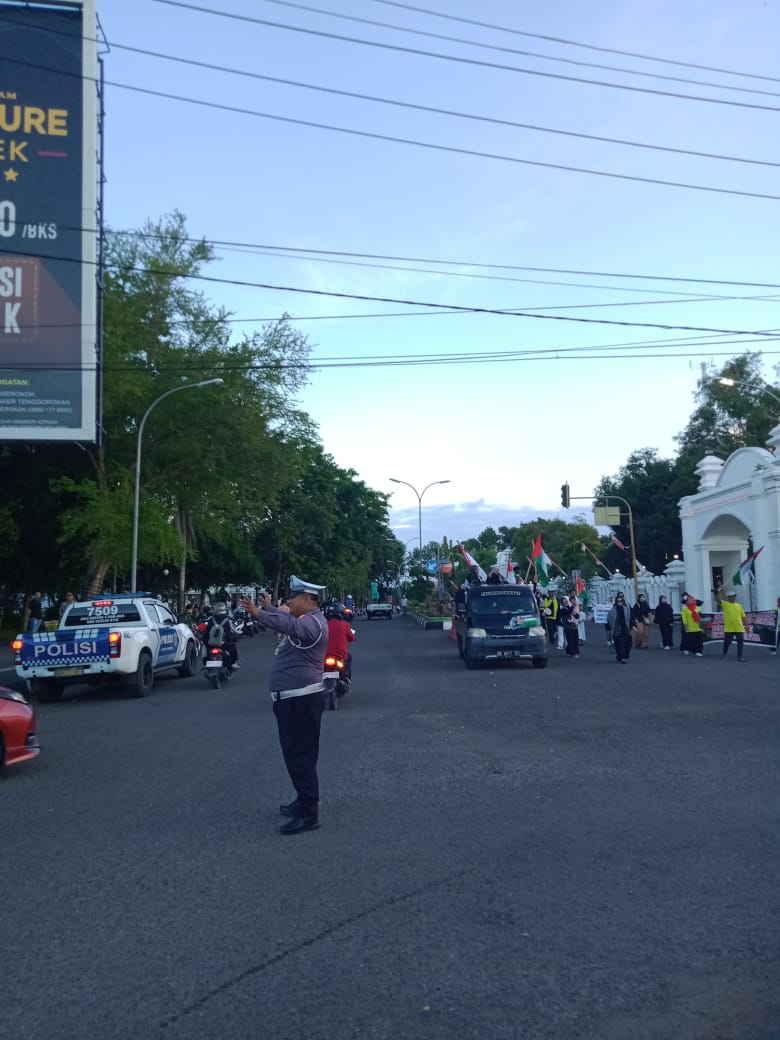 WATAMPONE, TRIBUNBONEONLINE.COM–Satlantas Polres Bone memberikan pengamanan dalam aksi solidaritas yang dilaksanakan Bone Peduli Kemanusiaan yang diisi dengan kegiatan long march bentuk dukungan aksi Global March To Gaza, Ahad sore (15/6/2025).