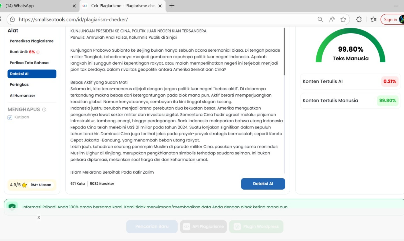 Kunjungan Prabowo Subianto ke Beijing bukan hanya sebuah acara seremonial biasa. Di tengah parade militer Tiongkok, kehadirannya menjadi gambaran rapuhnya politik luar negeri Indonesia. Apakah langkah ini sungguh demi kepentingan rakyat. atau malah memperlihatkan negeri ini terjebak menjadi pion tak berdaya, dalam rivalitas geopolitik antara Amerika Serikat dan Cina?