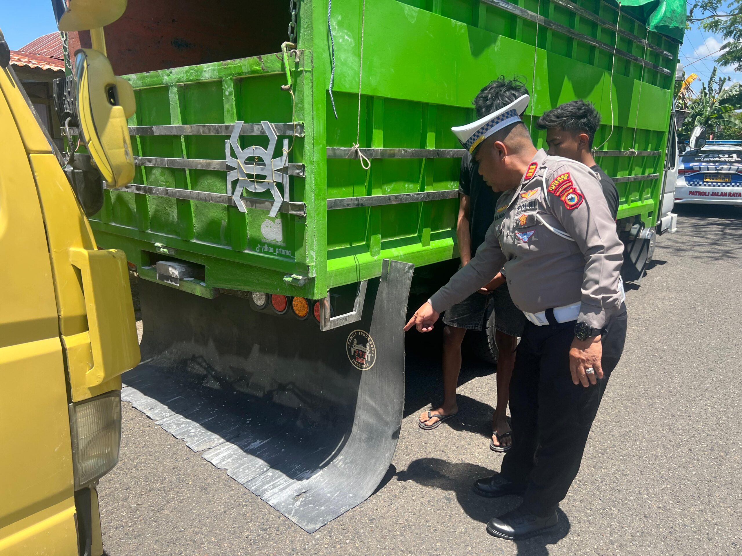 Saat menjalakan tugas Kasat Lantas melihat keberadaan truck yang menggunakan karpet lumpur menjuntai ke bawah dan kesamping. Tidak sesuai dengan spesifikasi teknis dan standar keselamatan dari pabrikan.