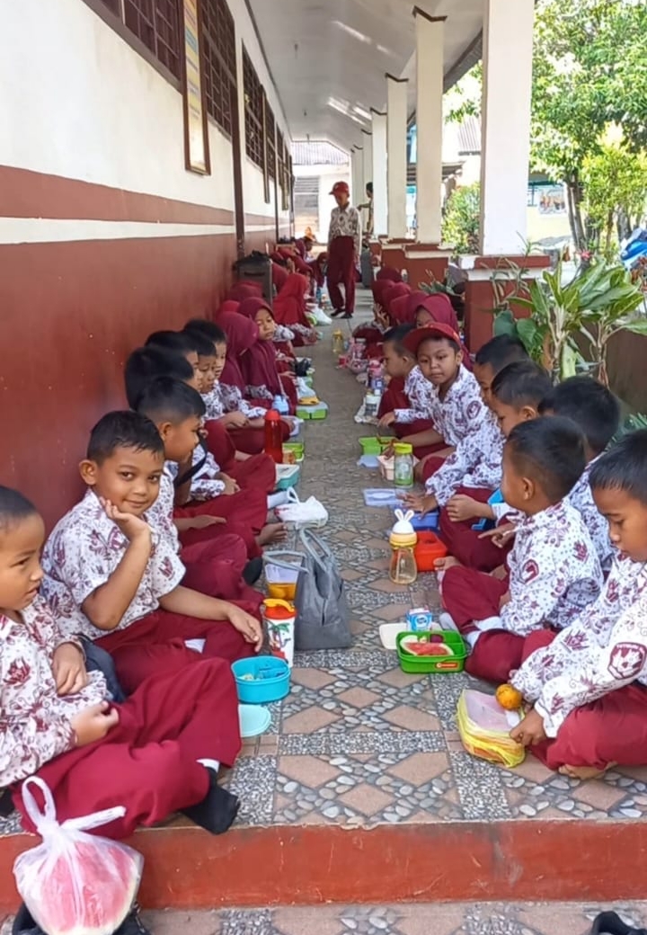 Kegiatan sarapan sehat dan makan buah bersama berlangsung penuh antusias. Murid-murid tampak ceria menikmati menu sarapan yang dibawa dari rumah masing-masing, dilengkapi dengan berbagai jenis buah segar.