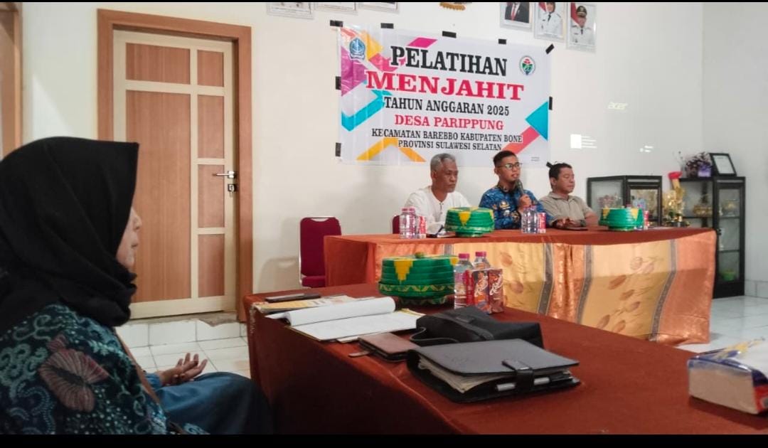 BAREBBO, TRIBUNBONEONLINE.COM–Pemerintah Desa Parippung melaksanakan kegiatan Pelatihan Menjahit Tahun Anggaran 2025 yang berlangsung di Aula Kantor Desa Parippung, Kecamatan Barebbo, Jumat (17/10/25). Kegiatan ini diikuti oleh sejumlah warga desa, khususnya ibu rumah tangga dan pemuda yang ingin mengembangkan keterampilan di bidang tata busana.