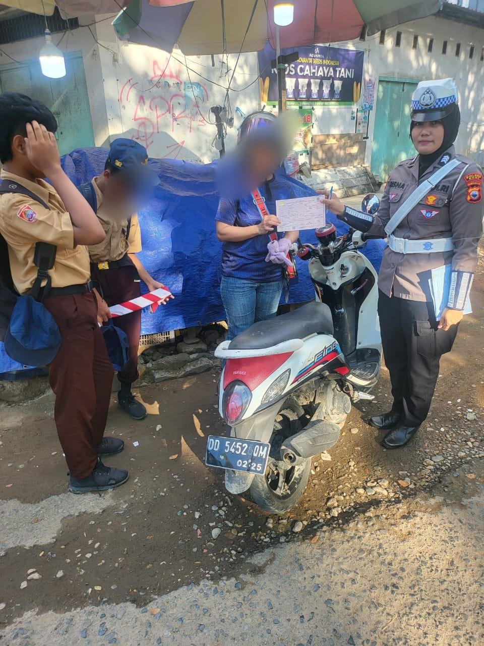Dengan simpatik personel memberikan tilang teguran dan memberikan edukasi tentang pentingnya penggunaan helm untuk keselamatan dan diimbau agar tidak mengendarai sepeda motor bonceng tiga.