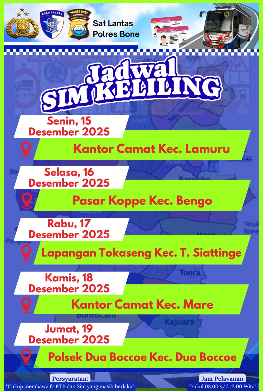 BONE, TRIBUNBONEONLINE.COM– Layanan SIM Keliling Satlantas Polres Bone kembali hadir di 5 titik Lokasi di wilayah Kabupaten Bone mulai Senin 15-19 Desember 2025.