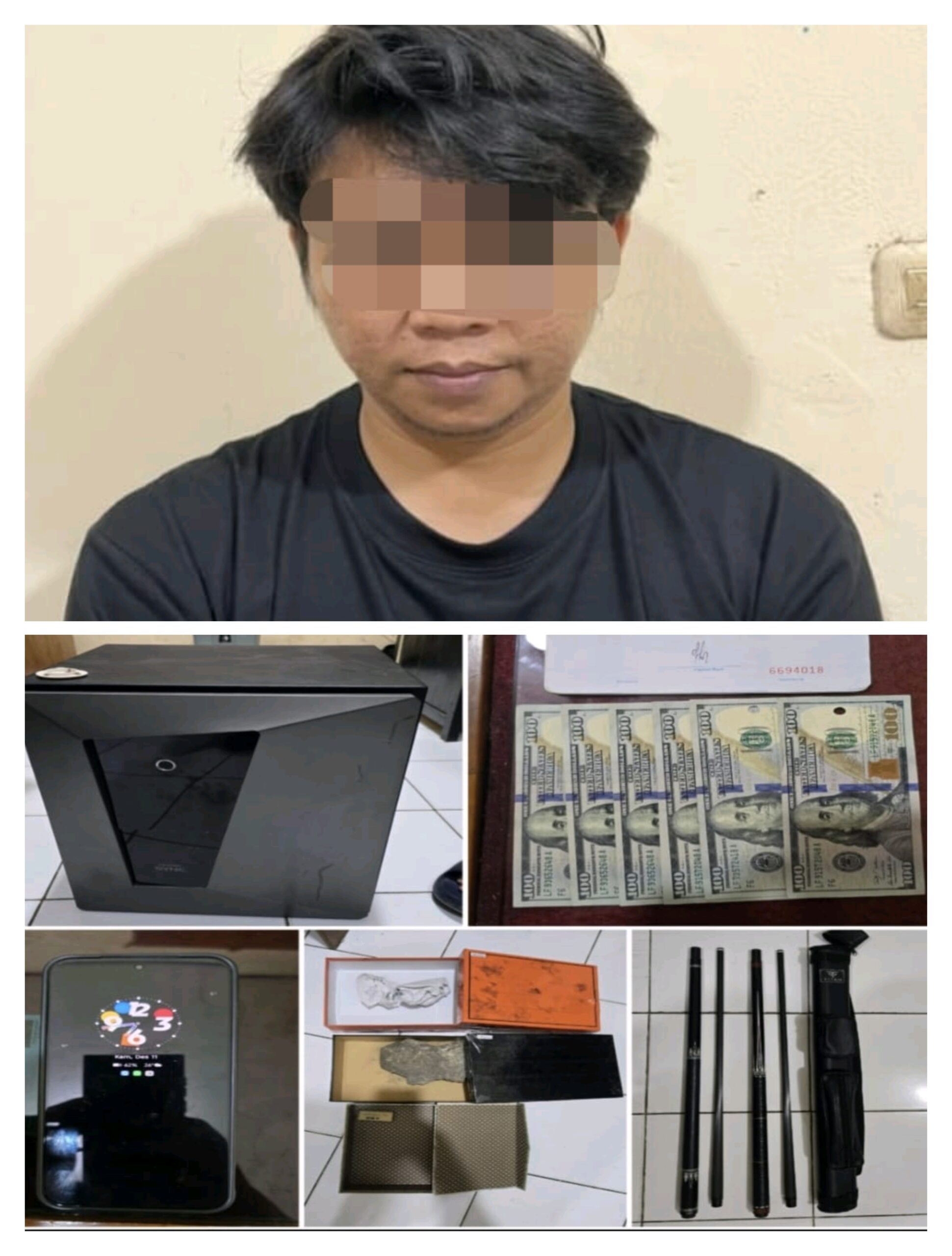 Pelaku ditangkap bersama sejumlah barang bukti, di antaranya satu buah brankas, satu buku rekening BCA, satu unit handphone, dua buah stik biliar, tiga buah kotak, dan enam lembar uang dolar Amerika pecahan 100 dolar.