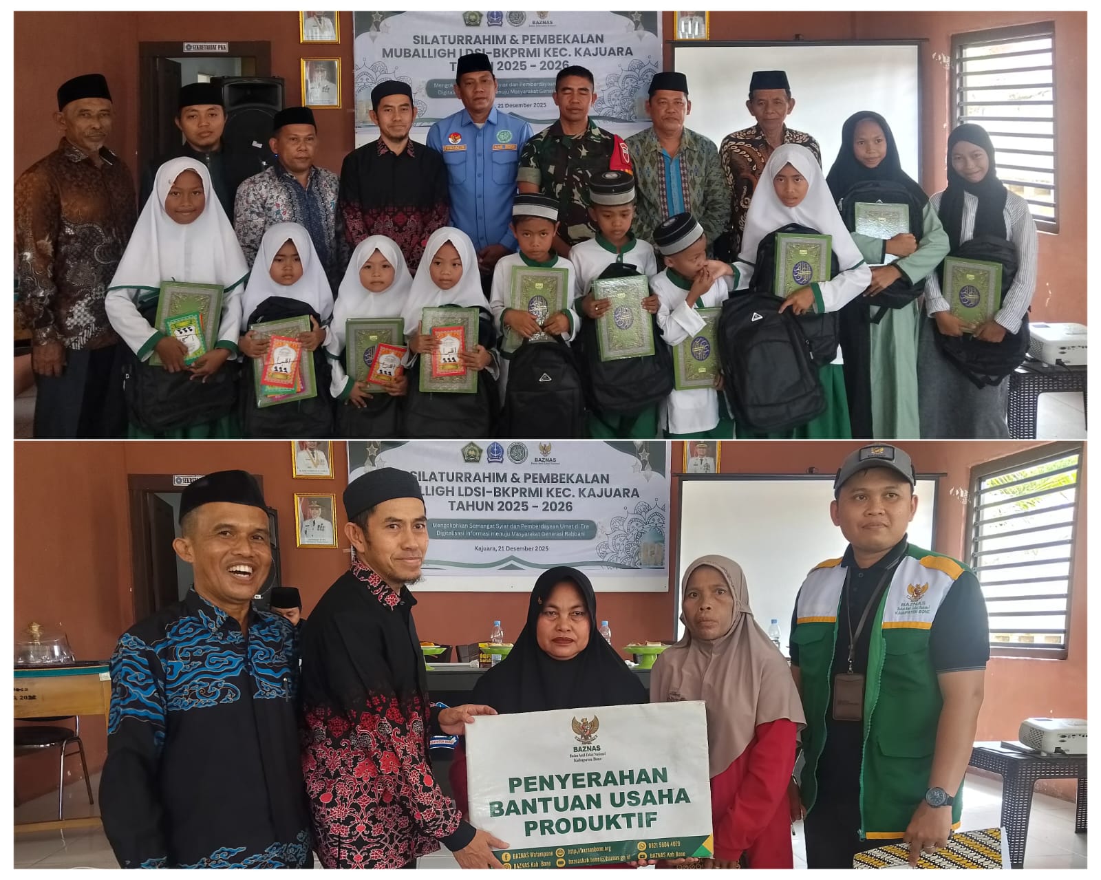 Selain memberikan pembekalan kepada para mubaligh, dalam kesempatan ini BAZNAS Kabupaten Bone juga menyerahkan bantuan kepada para santri berupa paket tas yang berisi Al Qur’an dan buku Iqro. Selain itu BAZNAS Kabupaten Bone juga menyerahkan bantuan usaha produktif kepada tiga warga Kecamatan Kajuara yaitu rukia warga Desa Gona, Rosmini Desa Lemo dan Nursiah warga Desa Angkue Kecamatan Kajuara. (Julfiadi)