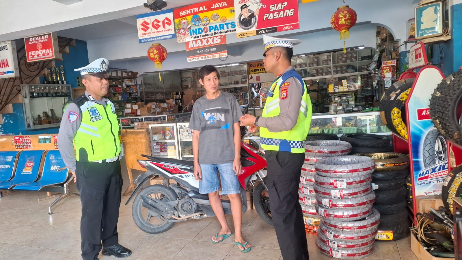 Unit Kamsel Satlantas Polres Bone memberikan imbauan dan sosialisasi kepada pemilik bengkel Toko Sentral Jaya Jalan Sukawati.