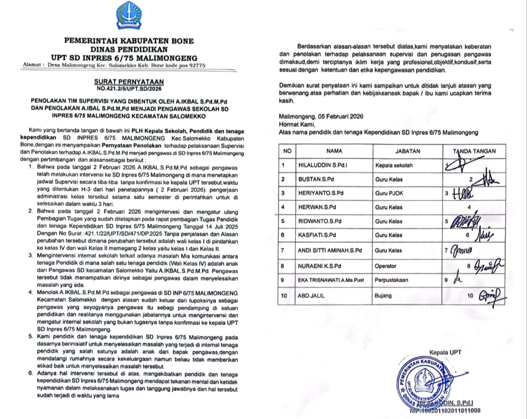 Yang mana surat pernyataan yang di buat pada Kamis 5 Februari 2026 itu termuat enam poin yang menjadi dasar penolakan. Dimana pihak sekolah menilai Andi Ikbal telah mengambil suatu tindakan yang di luar dari Tupoksi selaku pengawas yang menjadikan tenaga pendidik mengalami tekanan yang berujung terganggunya proses belajar mengajar di sekolah tersebut.