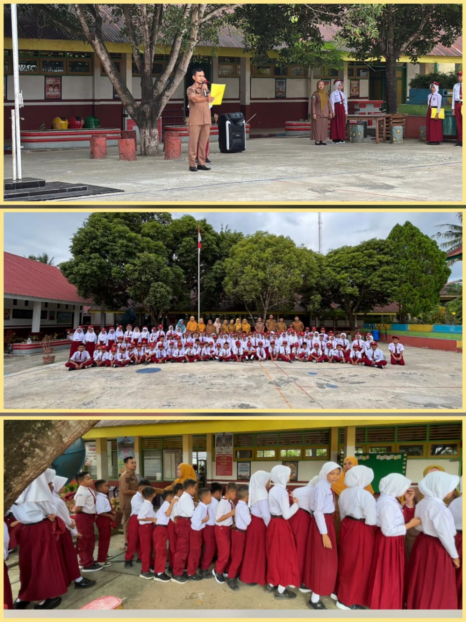 Upacara yang digelar di halaman sekolah berlangsung dengan penuh khidmat. Seluruh peserta mengikuti rangkaian kegiatan sesuai susunan upacara, termasuk pembacaan amanat serentak dari Menteri Pendidikan Dasar dan Menengah.