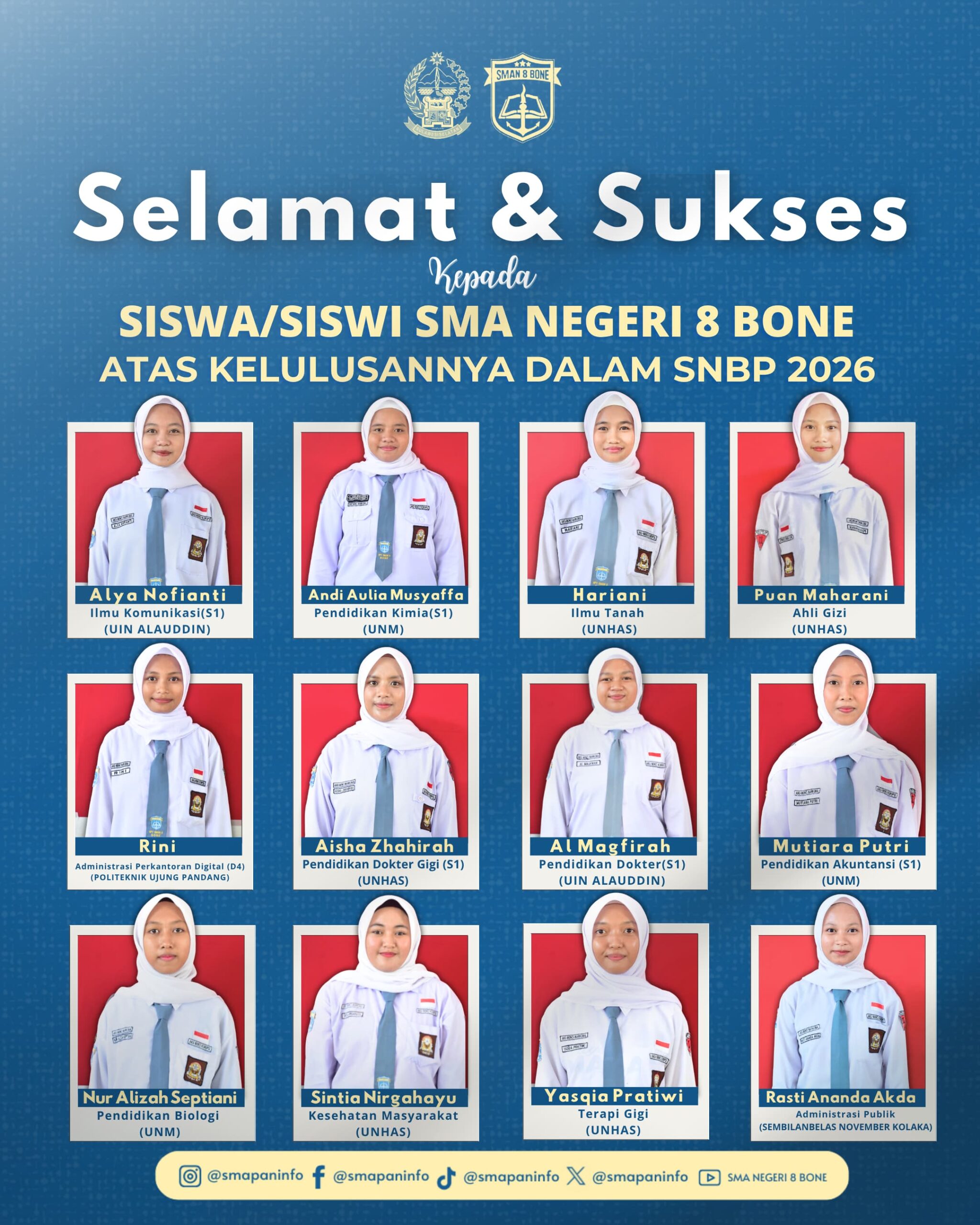 KAJUARA, TRIBUNBONEONLINE.COM– Prestasi membanggakan kembali ditorehkan oleh siswa-siswi SMA Negeri 8 Bone dalam Seleksi Nasional Berdasarkan Prestasi (SNBP) Tahun 2026. Sebanyak 18 siswi berhasil lolos dan diterima masuk di berbagai Perguruan Tinggi Negeri (PTN) ternama di Indonesia.