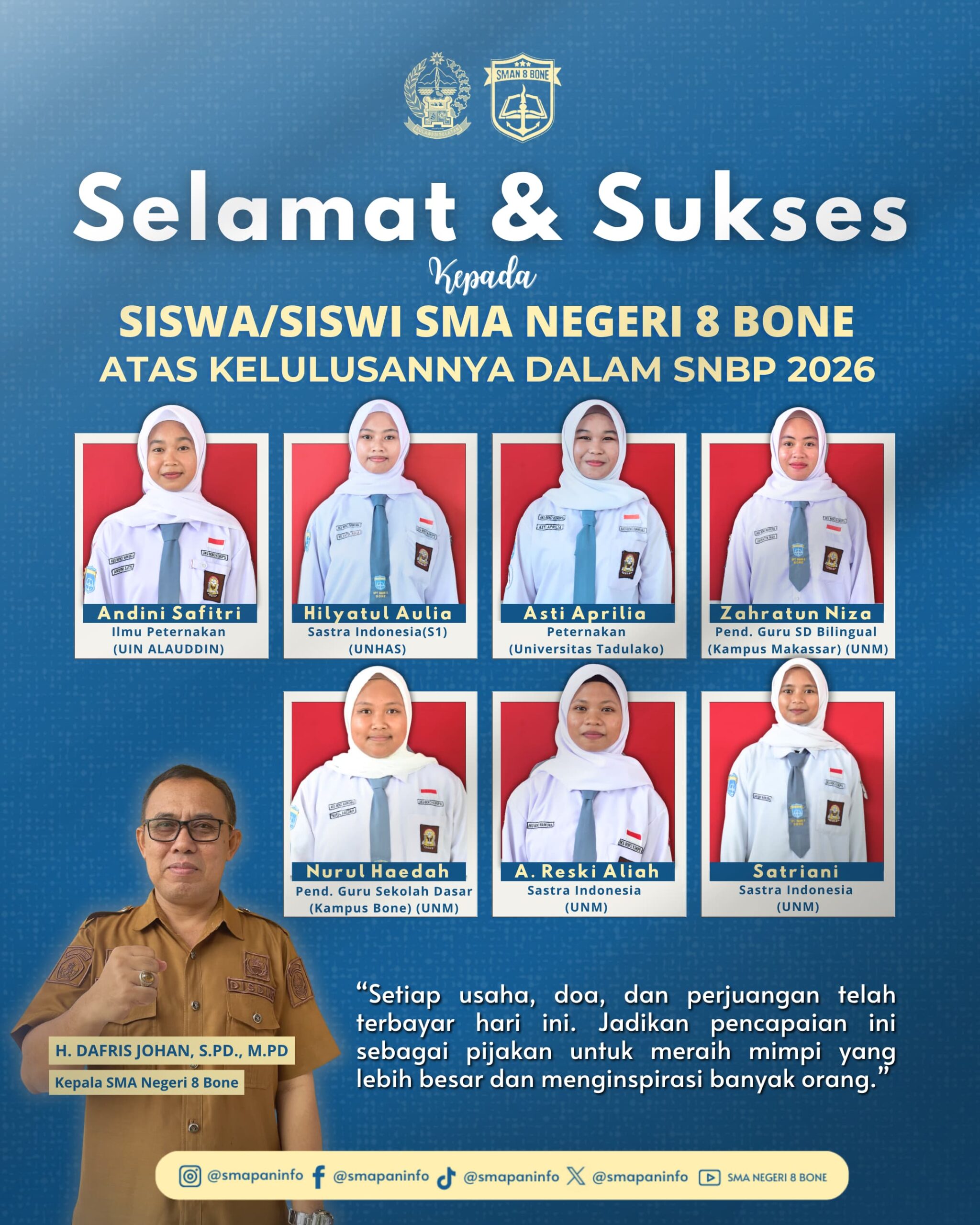 Kepala SMA Negeri 8 Bone H. Dafris Johan, S.Pd., M.Pd. menyampaikan apresiasi dan rasa bangga atas capaian ini serta berharap prestasi tersebut dapat menjadi motivasi bagi siswa lainnya untuk terus berprestasi dan menjaga nama baik almamater.