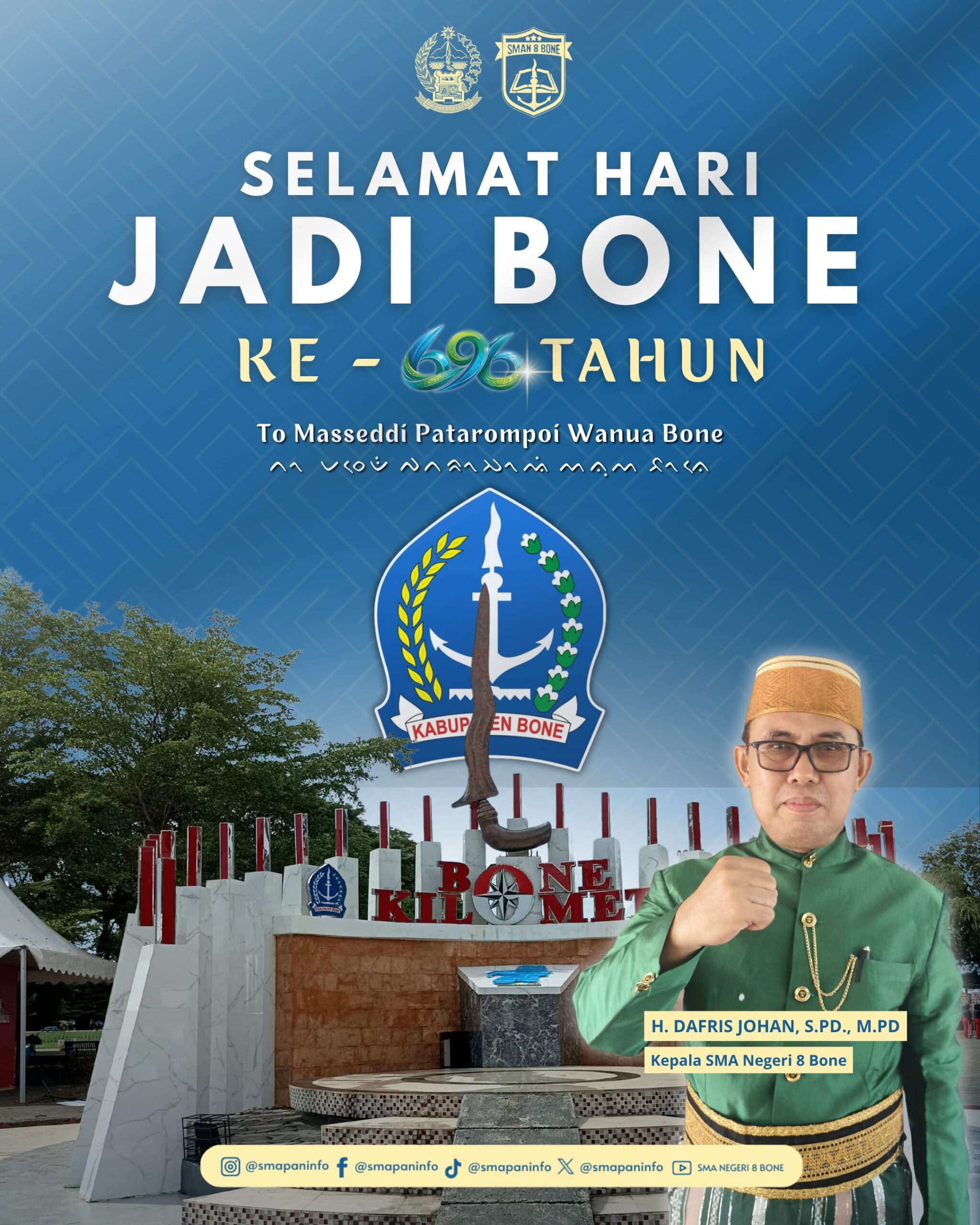 KAJUARA, TRIBUNBONEONLINE.COM– Keluarga besar UPT SMA Negeri 8 Bone turut menyampaikan ucapan selamat Hari Jadi Bone Ke- 696, Senin 6 April 2026. Ucapan ini disampaikan Kepala UPT SMA Negeri 8 Bone H. Dafris Johan, S.Pd, M.Pd.