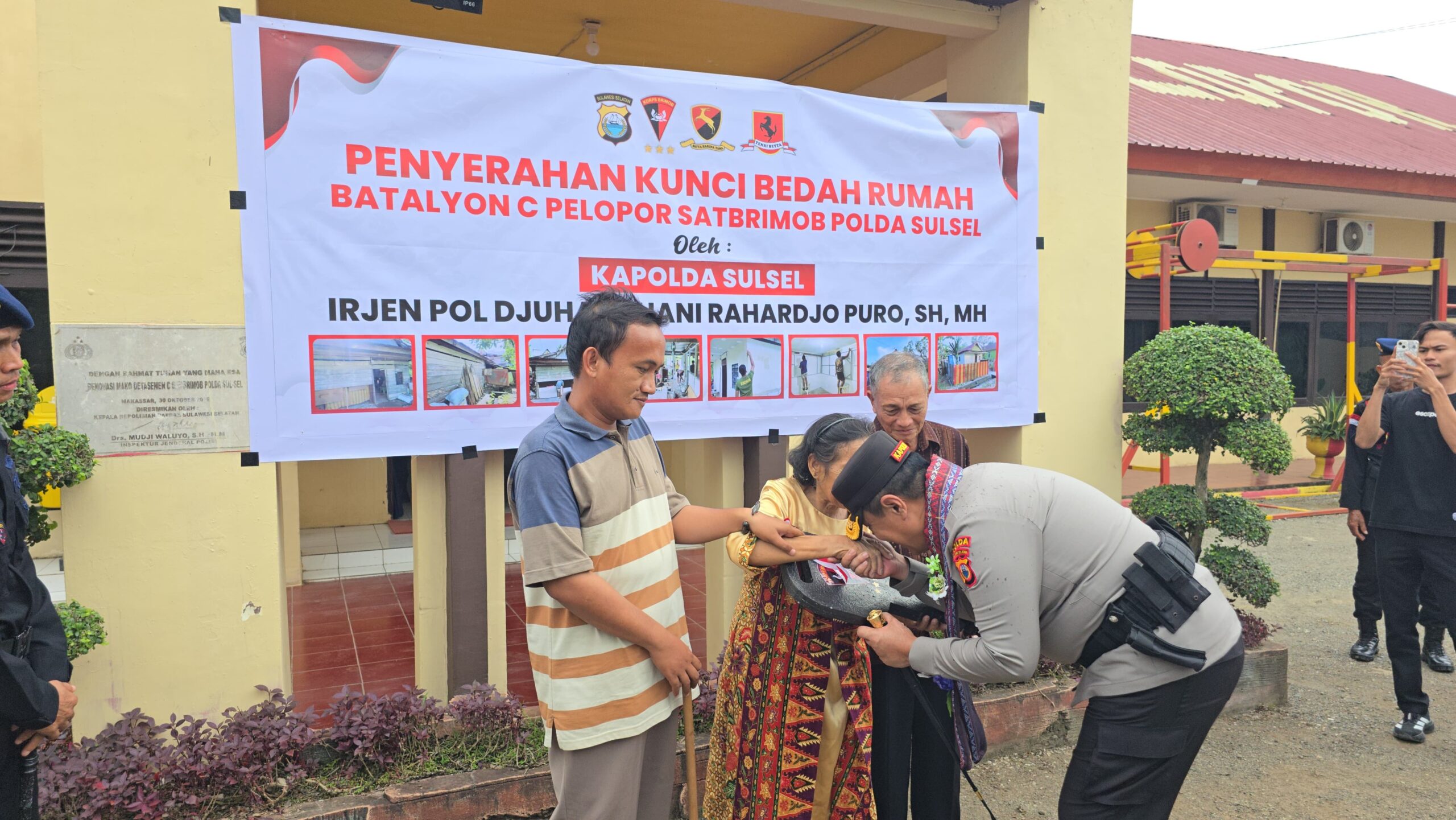 Bertempat di Mako Batalyon C Pelopor Satbrimob Polda Sulsel, suasana yang awalnya berlangsung khidmat dalam prosesi penyerahan bantuan program bedah rumah, seketika berubah menjadi haru.