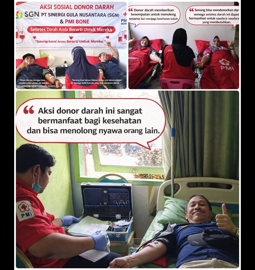 PT SGN sebagai salah satu perusahaan BUMN yang mengelola pabrik gula di Kabupaten Bone terus berkomitmen menjalankan program Corporate Social Responsibility (CSR) di bidang kesehatan. “Kerja sama dengan PMI Bone ini menjadi salah satu wujud nyata kontribusi perusahaan dalam mendukung ketersediaan stok darah di wilayah Sulawesi Selatan,”katanya.