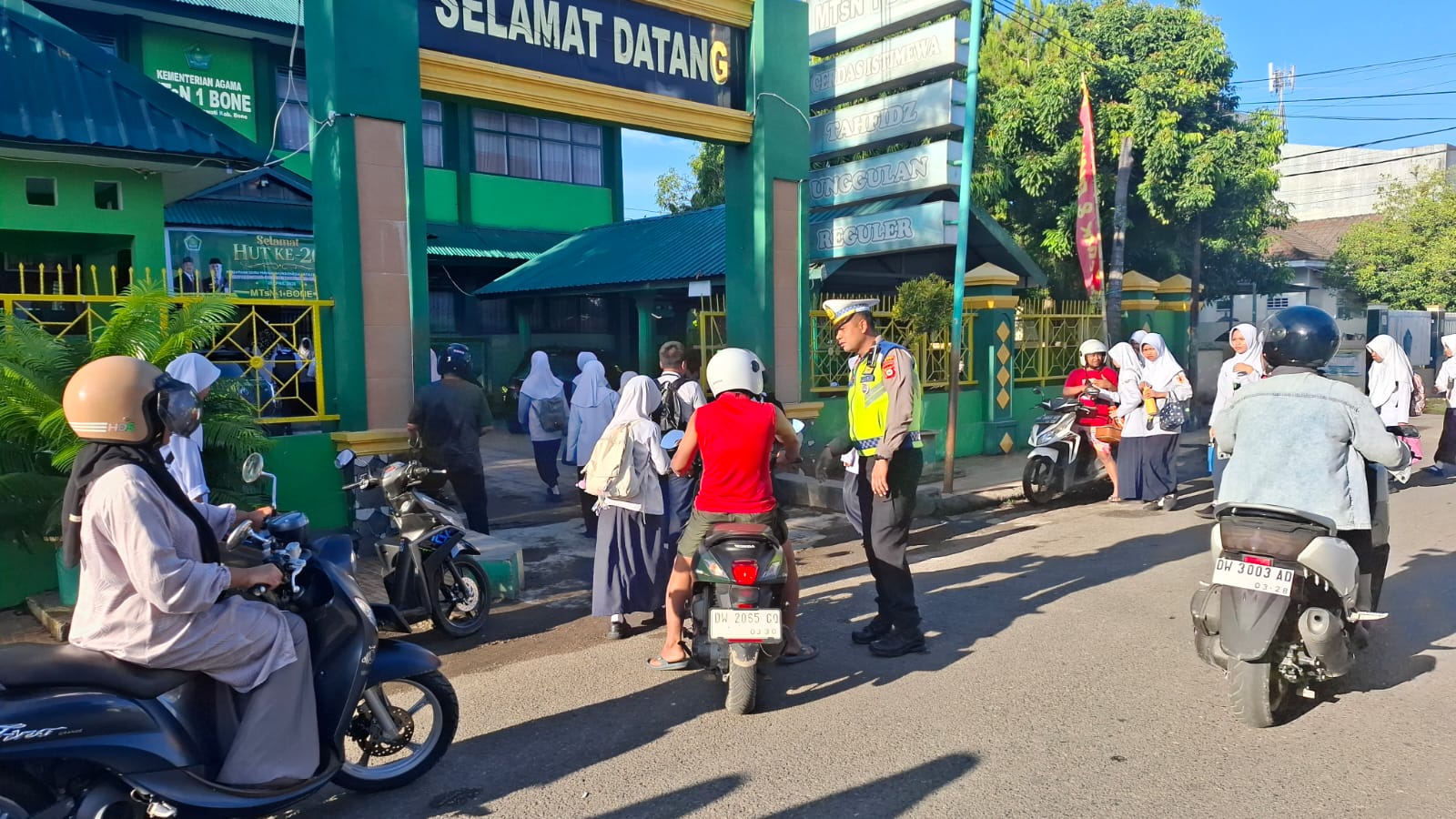 Personel Unit Kamsel melaksanakan kegiatan imbauan keselamatan berlalu lintas kepada orang tua pelajar yang mengantar anaknya ke sekolah serta kepada para guru di MTs Negeri 1 Bone.